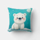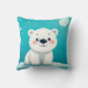 Cartoonish polar bear sitting on a small ice cap. The bear has a round face with big, expressive eyes and rosy cheeks, giving it a friendly appearance. Its fur is depicted in shades of white and light grey, and its ears are round and fluffy. The background is a serene blue, dotted with small white snowflakes and a large pale moon, creating a wintery atmosphere. The overall feel of the illustration is whimsical and charming, making it visually appealing.