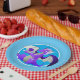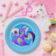 Cute blue paper plates featuring a purple dragon ready to enjoy a slice of cake