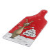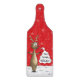 A glass cutting board in red with the image of a cartoon Reindeer and it’s excitement about the snow coming down.