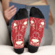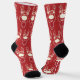Happy cartoon reindeer pattern on festive red Christmas socks.
