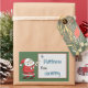 A merry cartoon Santa is pointing at the recipient's name. On green background, fill in to whom the gift is as well as from who it is. Leave empty if you want to fill in names by hand.