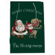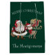 This colourful custom gift bag features a cute festive winter holiday theme. A cartoon illustration of Santa Clause, Rudolph the red-nosed reindeer, and a sleigh full of presents is printed in the centre. Faux gold glitter accents the image. The greeting Merry Christmas is printed above the cartoon with a sample family name printed below. The background is a dark forest green colour.