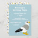 These customisable party invitations feature a cartoon illustration of a seagull. The bird is in white, grey, black and orange and set against a light blue background. Your party details appear in white lettering. The reverse side has a coordinating confetti print for a fun and festive look.