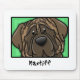 Cute kawaii brindle English Mastiff cartoon, inside a large green square. Underneath the illustration is the dog breed's name. Unique and charming Mastiff gifts for pet owners.