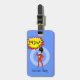 Fun luggage tag, with a cartoon super hero theme. Done in blue, yellow, red, and black with a cartoon super hero to protect your bag. Personalise the text to read what you want. Great luggage tag for boys.