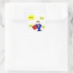 A fun design featuring a cartoon super hero in a blue suit, a red cape and black shoes. Fun super hero words around him... change as desired.