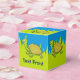Cartoon illustration of a happy turtle on grass under blue sky. Custom text.