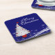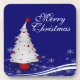 Funny looking cartoon white Christmas tree on a blue snowy background. Very cute and fun Christmas coasters.