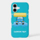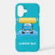 Smiling blue cartoon car washing under carwash brush. Custom text.
