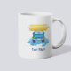 Smiling blue cartoon car washing under carwash brush. Custom text on both sides.