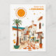 This postcard from the Casares, Málaga, Costa del Sol, Spain is a gorgeous piece of art. It features a beautiful Mediterranean old city with white houses, a cobblestone street, a palm tree, and a big sun. It's a perfect greeting card for Casares residents, visitors, tourists, or fans.