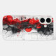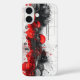 This vertical artwork features a cascade of concentric shapes, predominantly in **red**, **black**, and **white**, interspersed with fine splatters and intricate linework. The interplay between solid circular forms and chaotic splashes creates a balance between order and disorder. The composition evokes a sense of mechanical precision juxtaposed with organic chaos. The art style, **techno-surrealism**, combines a structured, almost industrial esthetic with abstract and expressive elements, resulting in a visually arresting design that feels modern and avant-garde.