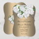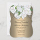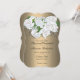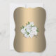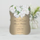 This beautiful wedding invitation showcases a stunning floral design on a metallic gold canvas, all on a very elegant bracket-shaped card. The top of the card features an exquisite arrangement of white roses and baby's breath, cascading down from the top of the card, reminiscent of a bridal bouquet. Our 'Cascading Roses Elegant Gold' wedding invite is perfect for a spring wedding, an outdoor ceremony or a more formal, sophisticated garden wedding. The graceful floral design and golden tones of the card create a visually appealing and harmonious effect. The back of the card continues the golden gradient theme with another beautiful bunch of white roses at the centre.