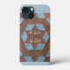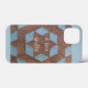 Quilt block in brown and blue "castle" pattern. The central "castle" is a brown star shape, surrounded by the "6 sided wall" with the "watch towers" extending out from the middle of the walls. Inside text reads "I Love Quilts"