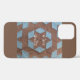 Quilt block in brown and blue "castle" pattern. The central "castle" is a brown star shape, surrounded by the "6 sided wall" with the "watch towers" extending out from the middle of the walls. Inside text reads "I Love Quilts"