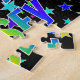 This fun, lively, birthday-themed jigsaw puzzle design features the message "HAPPY BIRTHDAY, CASEY" with the characters having a colorful rainbow spectrum inspired gradient pattern, in addition to a vibrant star shapes background pattern. A vibrant puzzle like this might be a fun way to send birthday wishes to somebody named Casey. [~Z0000468]