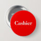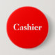 This pin back button has a red background with the word "Cashier". Perfect for business use or for garage sale, yard sales, or fundraisers. This button can be personalised with a name also.