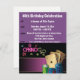 40th birthday party invitations with a fun casino or Las Vegas theme. Dice and playing cards with colourful purple scheme. Easy to personalise. Suitable for male or female. Playing cards show an ace. Casino chips are green and blue. Neon sign art says casino with stars and cocktail glasses. Art purchased at GraphicStock