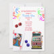 Casino themed bachelorette party invitation done in white with graphics of a Queen of Hearts , dice, confetti and a slot machine. Personalise the text to suit your party needs.