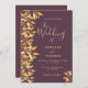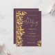 A trendy botanical wedding invitation in cassis, deep purple and faux gold. Decorated with faux gold foliage and sprigs. Modern large hand lettered script, typography with the text: The wedding of. Templates for your first names and wedding details. Golden text.
