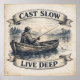 A quiet tribute to patience, craft, and the rhythm of the water. Cast Slow, Live Deep features an old fisherman alone in a wooden boat at dawn, rendered in etched, hand-drawn linework with muted blues and warm sepia tones. The calm lake and rising light evoke stillness and reflection, while the classic serif typography sits within a ribbon banner for an authentic vintage outdoorsman feel. Finished with a faded ink texture, this poster carries the timeless wisdom of slowing down, savoring the moment, and living with depth—perfect for cabins, lodges, workshops, or anyone drawn to the quiet pull of the water and the outdoors.
