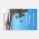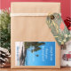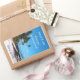 Large vertical, wine bottle sticker with a tropical island theme of palm trees, beach sand and blue water. Use the four areas of template text to customise with the bride's and groom's names, a short thank you message, wedding date and name of wine or spirits at the bottom. Place on wine, champagne or any bottle favour at the reception. Delete any of the example text to leave that area blank.
