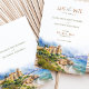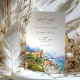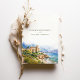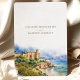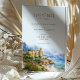 This elegant save the date card captures the romantic charm of Castell de Tamarit, located on the beautiful Spanish coastline. The front of the card features a stunning watercolor illustration of the castle perched above the Mediterranean Sea, evoking the serene beauty of a destination wedding. The minimalistic typography in warm brown and gold tones contrasts perfectly with the soft blues, greens, and sandy shades of the landscape. Ideal for couples planning a wedding in Spain or looking to capture the essence of a destination celebration, this card is a perfect blend of sophistication and natural beauty.
