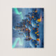 Jigsaw puzzle of an impressive castle made of igloos and stone, in a winter landscape of snow and pine trees. Magical aurora lights play in the evenfall sky, bathing the mountains and valley in a surreal atmosphere of heavenly colors. Amidst the misty strands of cold and snow, the stronghold castle known as "Winter Fire" stands. It is the last bastion of civilization and warmth before a vast expanse of frozen tundras, snowcapped mountains, and haunted forests open themselves to the wanderlust of the willing traveler... This artwork was created with ImageFX and upscaled with Leonardo.ai. Additional editing was done offline by me.