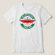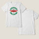 This promotional logo for a new t-shirt collection of an Italian brand features a circular shape with graphic elements extending outward. At the top, on a green background, is the words “NEW T-SHIRT COLLECTION” in white. In the centre, inside a stylised shield, it reads “ITALIAN BRAND” at the top and “LUXE CASUAL” in the middle, both in black. Below, in red, is “DEFINITE 2025.” At the bottom, on a green background, is “PIEDMONT - TURIN” in white. The predominant colours are green, white, black and red, recalling the Italian flag and emphasizing the origin of the brand. The central shield lends prestige and tradition, while the green arrows suggest dynamism. The style is modern and elegant, with simple but effective characters, making the logo recognisable and memorable. The design clearly communicates the brand's Italian identity, the launch of a new t-shirt collection, and a sense of casual luxury, with specific reference to the Piedmont region and the city of Turin.