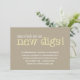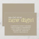 This cute, casual housewarming party invite features fun, whimsical lettering that reads "Come check out our new digs!" against a faded brown background.