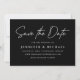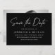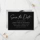 Simple save the date card featuring "Save the Date" in a white handwritten script with a black background. Personalize the modern save the date card by adding your names, wedding date, wedding location, wedding website, etc. The minimalist save the date card reverses to display your favorite horizontal engagement photo.