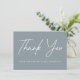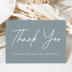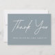 Simple wedding thank you card featuring "Thank You" displayed in a white handwritten script with a dusty blue background. Personalise the front of the modern thank you card by adding your name. Add your custom message to the back.