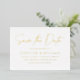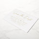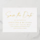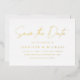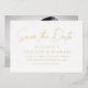 Simple save the date card featuring "Save the Date" in a handwritten gold foil script with a white background. Personalise the modern save the date card by adding your names, wedding date, wedding location, wedding website, etc. The minimalist save the date card reverses to display your favourite horizontal engagement photo.