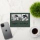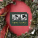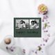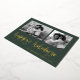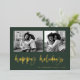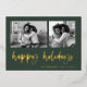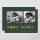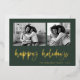 This simple classic green family holiday photo card features modern, casual gold foil script typography that says "happy holidays", with a two photo grid on the front for a stylish, modern and minimalist holiday design.