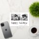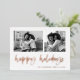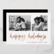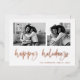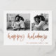 This simple classic white family holiday photo card features modern, casual rose gold foil script typography that says "happy holidays", with a two photo grid on the front for a stylish, modern and minimalist holiday design. The back of the card is black.