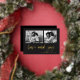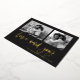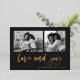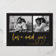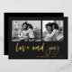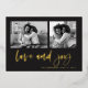 This simple classic charcoal black family holiday photo card features modern, casual gold foil script typography that says "love and joy", with a two photo grid on the front for a stylish, modern and minimalist holiday design.