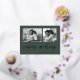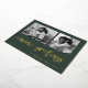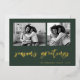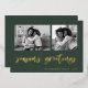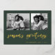 This simple classic green family holiday photo card features modern, casual gold foil script typography that says "season's greetings", with a two photo grid on the front for a stylish, modern and minimalist holiday design.