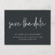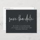 A modern save the date postcard with "save the date" in faux silver foil handwritten lettering on a rich, soft black background. Personalize with your names, wedding date and wedding location beneath in white lettering.