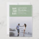 Bold and casual white typography and frame, single photo save the date card with sage green colour backgrounds.