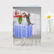Birthday tabby cat and red tulip bouquet on a round table with blue and white gingham tablecloth.