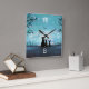 Two dogs and cat silhouette watching the sunset on a winter evening. In colours of blue, black and white. With two trees on both sides and birds flying towards the sunset. Snowflakes falling and a couple of bright stars in the sky. Winter scenery Original Acrylic Painting Art done by Donna Leger for Irony Designs. All Rights Reserved