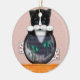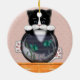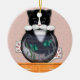 A black and white cat hanging on a fishbowl with two green fish inside. The fishbowl is sitting on top of a woodgrain dresser. The background is a star burst in pink with little paw prints.