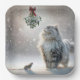 A fluffy cat and a tiny mouse gaze at a bunch of mistletoe adorned with a red bow as snowflakes gently fall around them