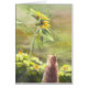Watercolor of morning sun on cat, sunflower and nasturtium flowers.