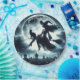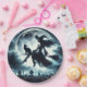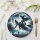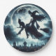 A witch with flowing hair and a pointed hat gracefully flies across the moonlit sky on a broomstick accompanied by a black cat