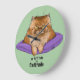 An orange Persian cat on a royal purple pillow is showing their attitude in a backdrop of green