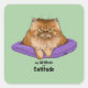 An orange Persian cat on a royal purple pillow is showing their attitude in a backdrop of green