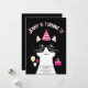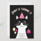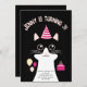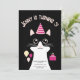 A cute birthday invitation card feauturing an illustration with the head of a black and white cat on a black background, with a pink party hat, ballons and a birthday cake. The text on the card is customisable.