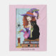 A cute red haired witch all in purple with her black cat sitting on a pile of books. Potions, spider and a candle in backdrop of pink