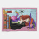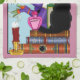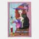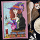 A cute red head witch all in purple with her black cat sitting on a stack of books. Potions, spider and candle in a backdrop of pink